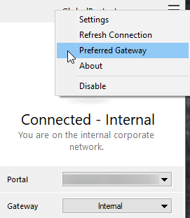 - From the menu on the top right of the app’s status panel, select Preferred Gateway to open the GlobalProtect: Preferred Gateway dialog.
