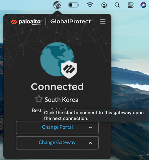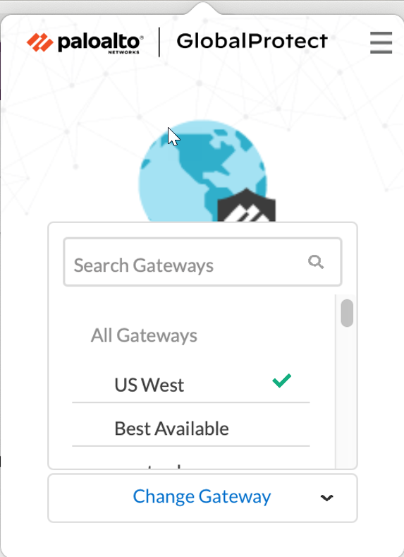 - Launch the GlobalProtect app by clicking the system tray icon. The status panel opens.(Optional) If you are logging in to the GlobalProtect app for the first time, enter the FQDN or IP address of the GlobalProtect portal, and then click Connect.(Optional) If multiple portals are saved on your app, select a portal from the Change Portal drop-down. By default, the most recently connected portal is pre-selected from the Change Portal drop-down.(Optional) By default, you are automatically connected to the Best Available gateway, based on the configuration that the administrator defines and the response times of the available gateways. To connect to a different gateway, click the Change Gateway drop-down and then use one of the following options: