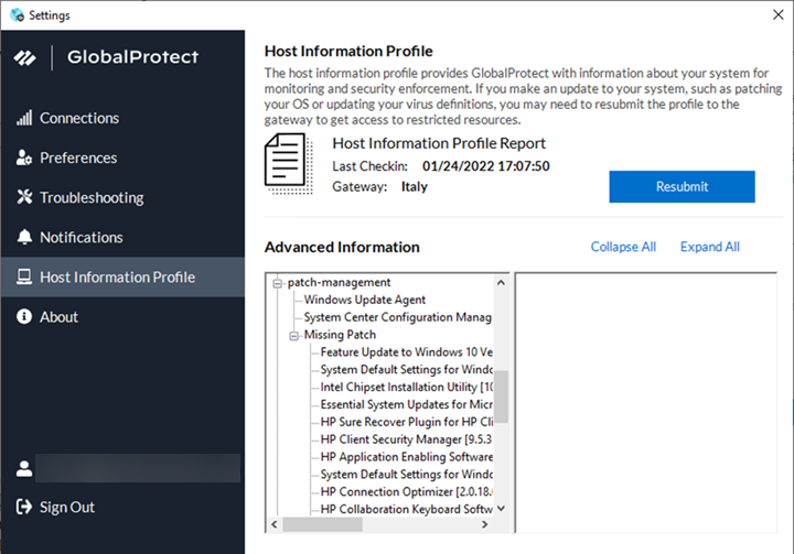 Starting from GlobalProtect app version 6.2.3, session and idle timeout messages are suppressed for the always-on connect method.Starting from GlobalProtect app version 6.2, you can extend the login lifetime session of the GlobalProtect app before it expires to avoid abrupt app session logout. The login lifetime expiry notification informs you in advance when the app sessions are about to expire and provides the option to extend the duration of the user session so that you are not logged out of your session abruptly. The app will display the expiry notification with extend user session option if your administrator has configured the notification settings for extending the session. - Host Information Profile—The Host Information Profile tab displays the endpoint data that GlobalProtect uses to monitor and enforce security policies using the Host Information Profile. You can Resubmit to manually resubmit HIP data to the gateway.