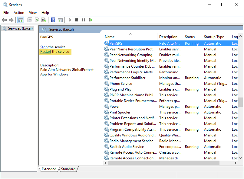 Restart the GlobalProtect application and GlobalProtect service (PanGPS):