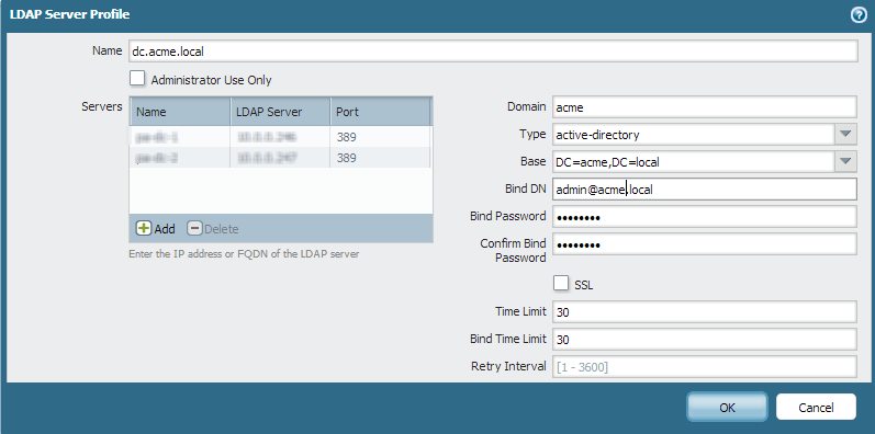 The server profile instructs the firewall on how to connect to the authentication service. Local, RADIUS, Kerberos, SAML, and LDAP authentication methods are supported. This example shows an LDAP authentication profile for authenticating users against the Active Directory.
