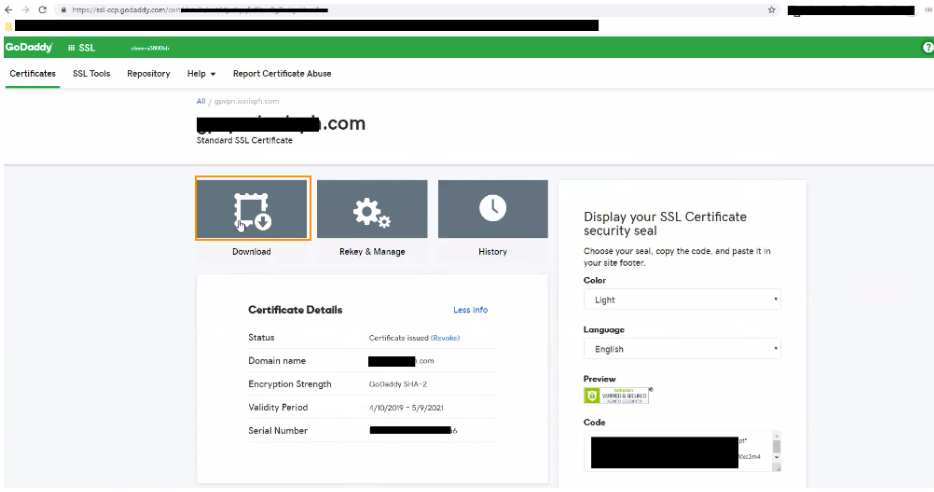 Download the renewed certificate from your third-party CA. As an example, the following steps show how to download the renewed certificate from GoDaddy:- Log in to the godaddy.com portal.Go to the Certificates tab.Select the certificate and click Download.
