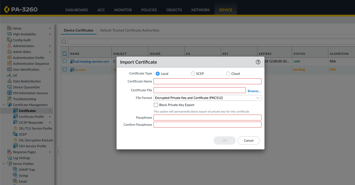 In the Download Certificate window, for Server type, select Other and download the certificate in .crt format.The certificate is saved to your downloads folder.Import the downloaded certificate on the firewall that is hosting your portal or gateway.If you deployed two firewalls in an HA pair in an active/passive deployment, you must import the certificate on each firewall.- From the web interface, go to DeviceCertificate ManagementCertificates.Highlight the certificate to be renewed and click Import.Enter the exact Certificate Name for the portal or gateway certificate that you're replacing.For the Certificate File, browse to and select the certificate that you downloaded from the CA.For the File Format, select Base64 Encoded Certificate (PEM).