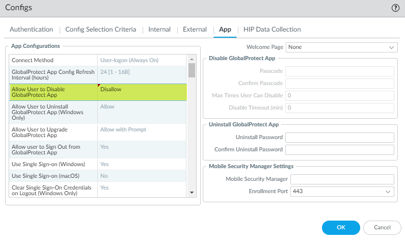 - To prevent users from disabling the GlobalProtect app, set the Allow User to Disable GlobalProtect App option to Disallow.