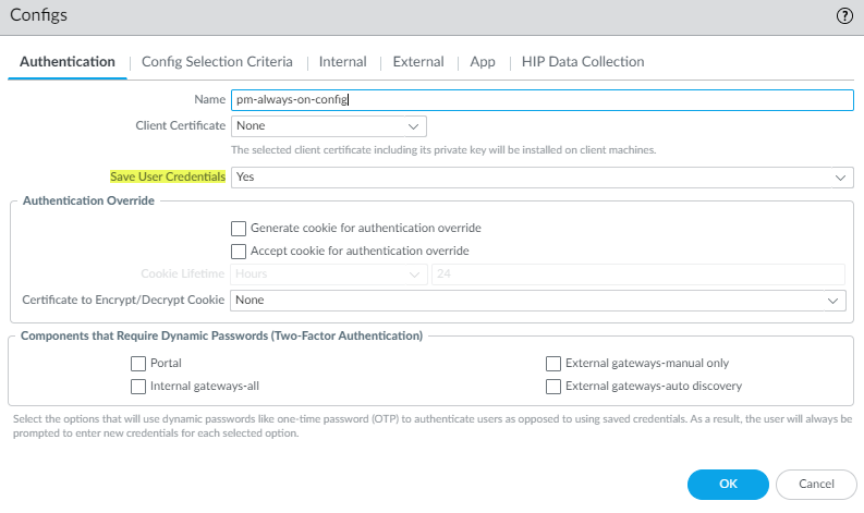 - From your portal agent configuration (NetworkGlobalProtectPortals<portal-config>Agent<agent-config>), select Authentication.