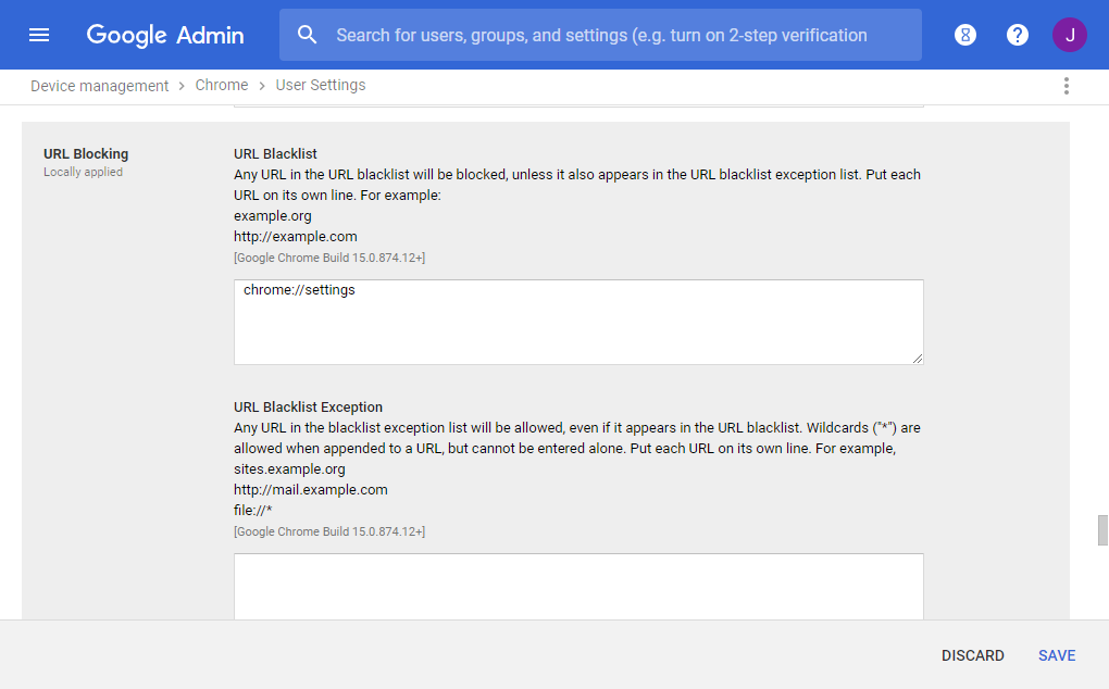 - In the Content > URL Blocking area, enter chrome://settings in the URL Blocklist text box.