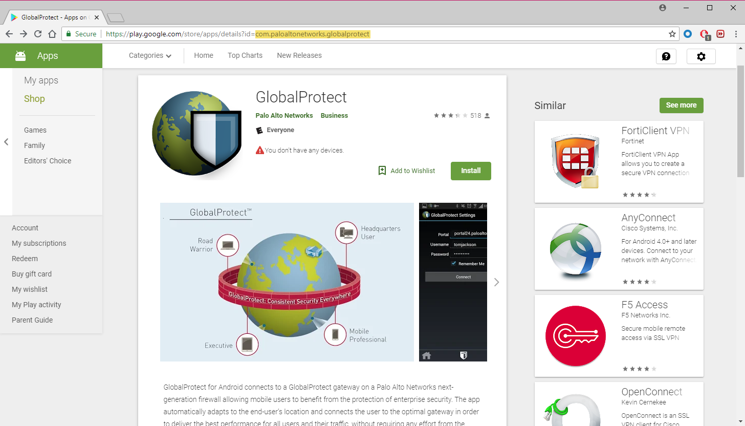 The GlobalProtect app for Android is supported only on certain Chromebooks. Chromebooks that do not support Android applications must continue to run the GlobalProtect app for Chrome, which is not supported starting with GlobalProtect app 5.0 and later.