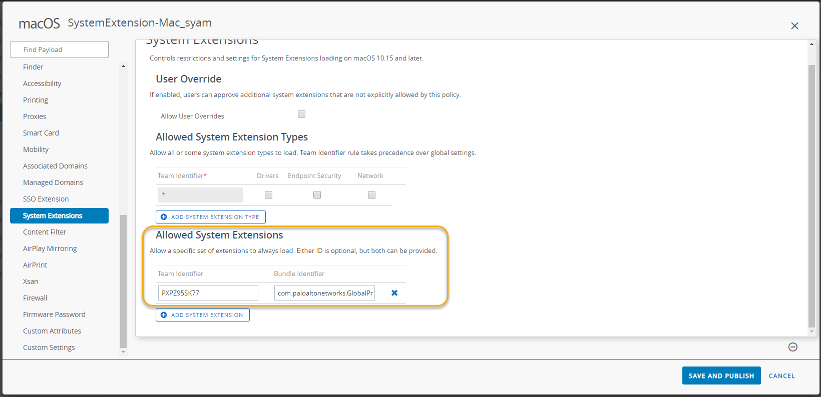 - Select System Extensions.Enter the Team Identifier used by the GlobalProtect app (PXPZ95SK77).Enter the Bundle Identifier (com.paloaltonetworks.GlobalProtect.client.extension)