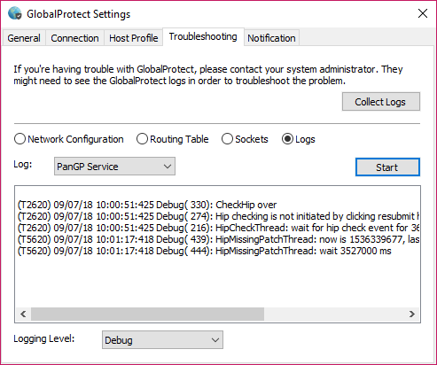 Select Settings.From the GlobalProtect Settings panel, select Troubleshooting.Select either Debug or Dump from the Logging Level drop-down.(Optional—Windows only) View your GlobalProtect logs:- Select Logs.Choose a Log type.Start viewing logs.
