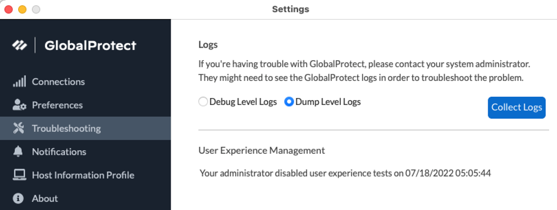 (Optional) Collect Logs to send to your GlobalProtect administrator for troubleshooting.