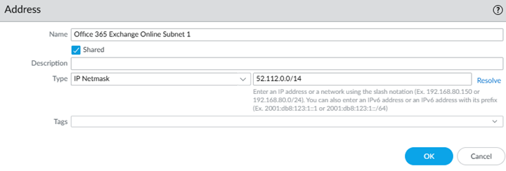 - Define the address group (for example, Office 365 Exchange Online) and add all the address objects you created in the previous step.