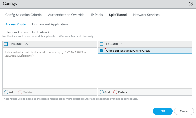 Apply the address group to your split tunnel exclude access route configuration.- Select your gateway configuration.