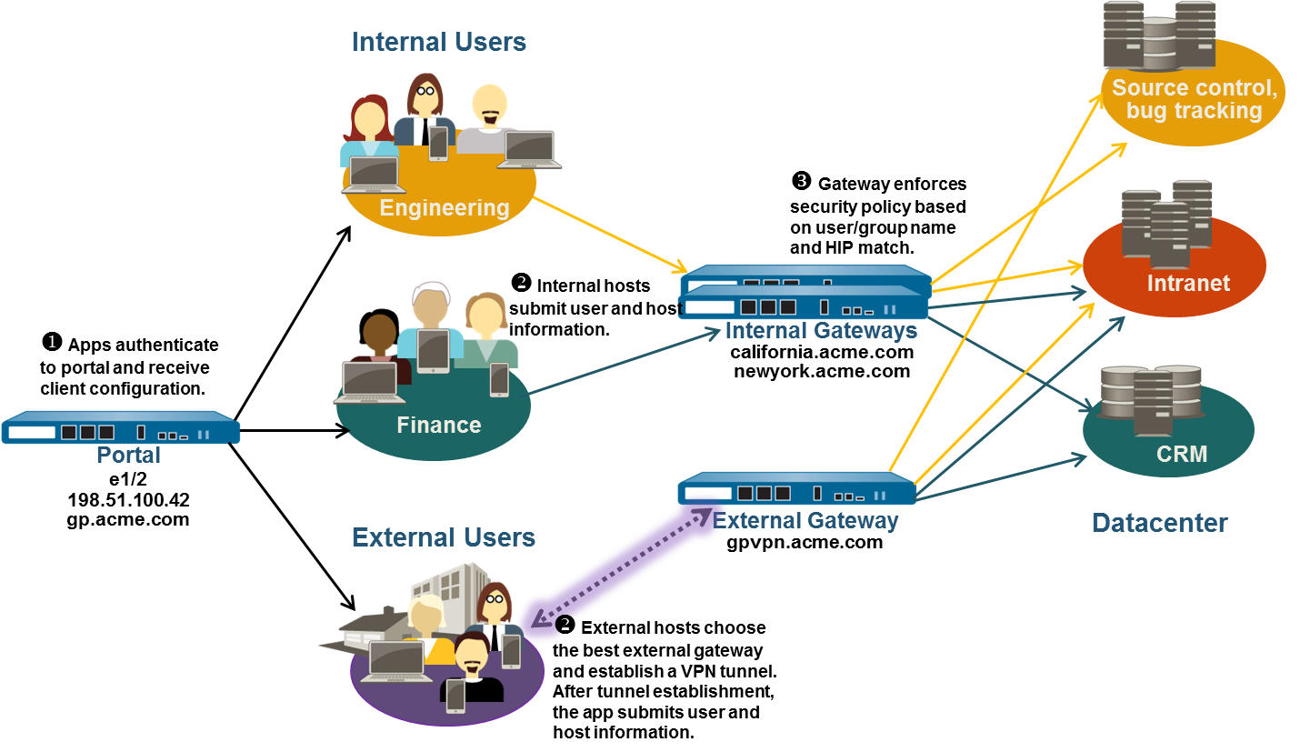 It's not necessary to configure the client authentication settings under the Authentication tab in the gateway (unless you want to set up HIP notifications) because tunnel connections are not required. See Configure a GlobalProtect Gateway for step-by-step instructions on how to configure a gateway.Configure the GlobalProtect Portals.Although this example shows how to create a single client configuration to be deployed to all apps, you could also create separate configurations for different uses and then deploy them based on user/group name and/or the endpoint operating system on which the app is running.Select NetworkGlobalProtectPortals and Add the following portal configuration:- Set Up Access to the GlobalProtect Portal:Interface—ethernet1/2IP Address—198.51.100.42Server Certificate—GP-server-cert.pem issued by GoDaddy with CN=gp.acme.comDefine the GlobalProtect Client Authentication Configurations:Internal Host Detection—enabledUse single sign-on—enabledConnect Method—User-logon (Always On)External Gateway Address—gpvpn.acme.comInternal Gateway Address—california.acme.com, newyork.acme.comUser/User Group—anyCommit the portal configuration.Deploy the GlobalProtect App Software.In this example, use the procedure to Host App Updates on the Portal.Create security policy rules on each gateway to safely enable access to applications for your VPN users.