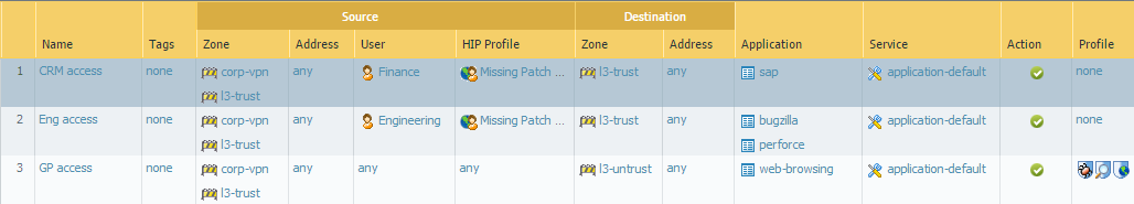 - Create HIP-enabled and user/group-based policy rules to enable granular access to your internal datacenter resources.