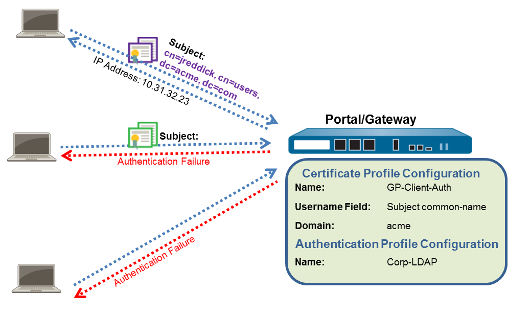 - If the certificate profile specifies a username field, the certificate that the user presents must contain a username in the corresponding field. For example, if the certificate profile specifies that the username field is Subject, the certificate presented by the user must contain a value in the common-name field, or else authentication fails. In addition, when the username field is required, the value from the username field of the certificate is automatically populated as the username when the user attempts to enter credentials for authenticating to the authentication profile. If you do not want force users to authenticate with a username from the certificate, do not specify a username field in the certificate profile.