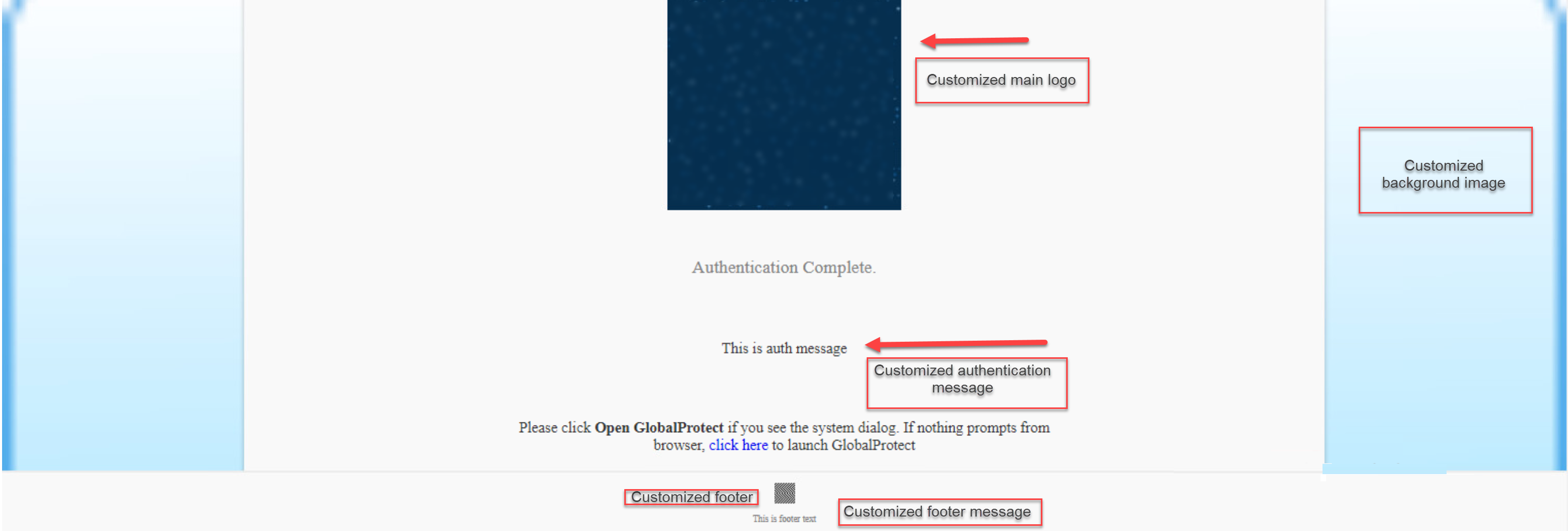 Use the following CLI commands to customize the fields of the SAML/CAS ACS landing page:set global-protect auth-response-page background-image <value>set global-protect auth-response-page main-logo <value>set global-protect auth-response-page auth-message <value>set global-protect auth-response-page footer-logo <value>set global-protect auth-response-page footer-text <value>