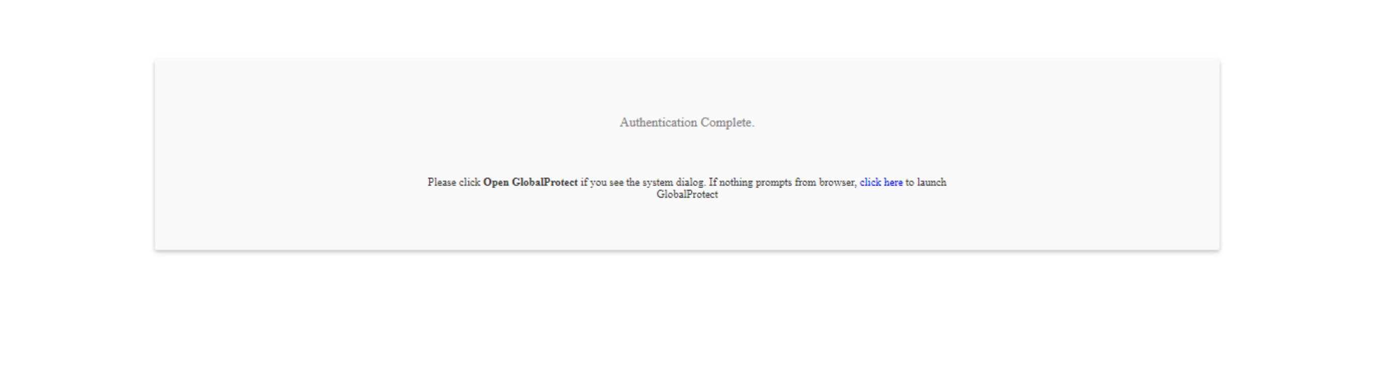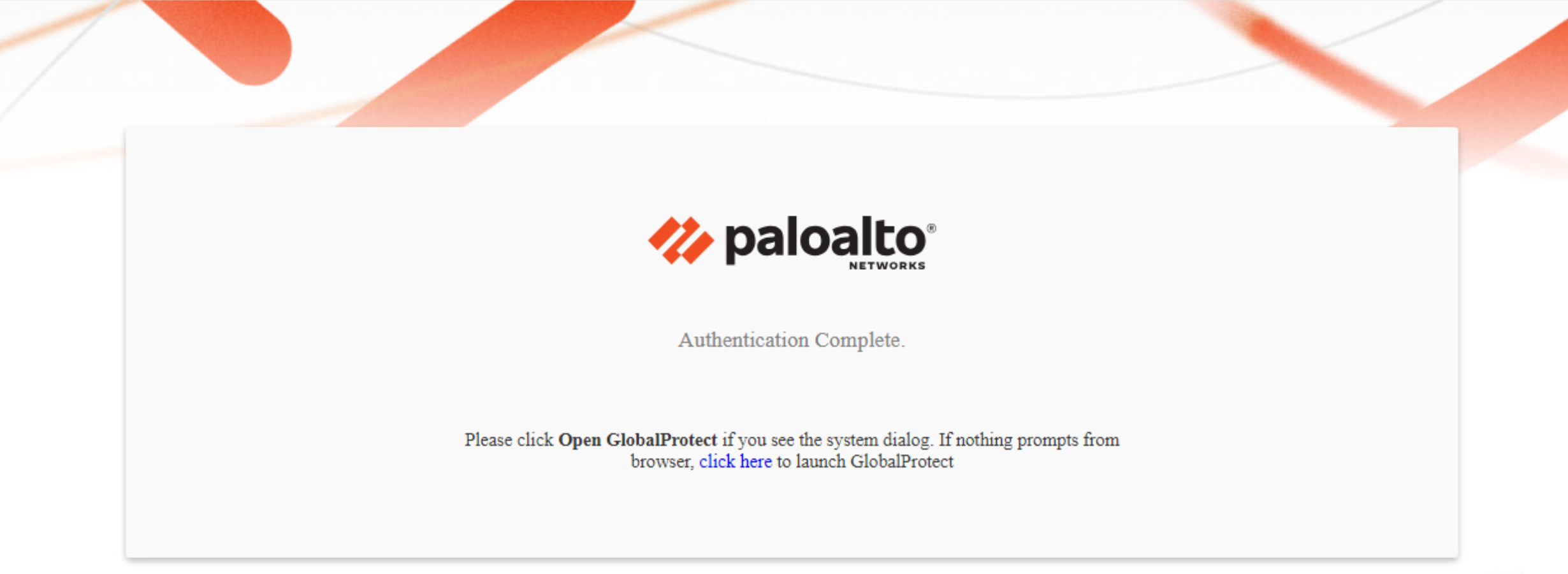 set global-protect auth-response-page type <default>When you configure the global-protect auth-response-page type as <default> and the authentication is successful, the default ACS page is displayed with Authentication Complete message. If the Authentication fails, the screen displays the Authentication Failed message.