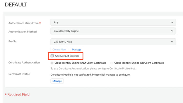 Starting with PAN-OS version 11.1.0, the browser selection for SAML authentication is