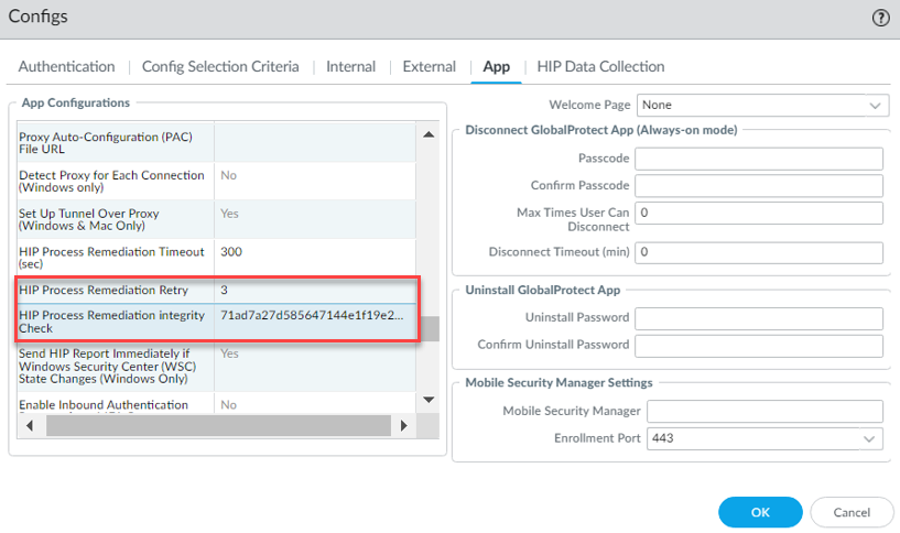 - Under Enforcement, configure HIP Process Remediation Timeout, HIP Process Remediation Retry, and HIP Process Remediation Integrity Check.