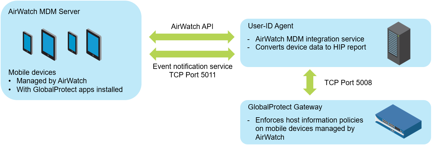 The Windows-based User-ID supports Workspace ONE MDM integration service, enabling GlobalProtect to use the host information collected by the app to enforce HIP-based policies on devices managed by Workspace ONE. Running as part of the Windows-based User-ID agent, the Workspace ONE MDM integration service uses the Workspace ONE API to collect information from mobile endpoints that are managed by VMware Workspace ONE and translate this data into host information.