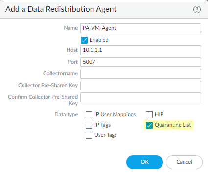 The following example shows a data redistribution agent where Panorama distributes the Quarantine List information to the firewall with an IP address of 10.1.1.1 using port 5007.