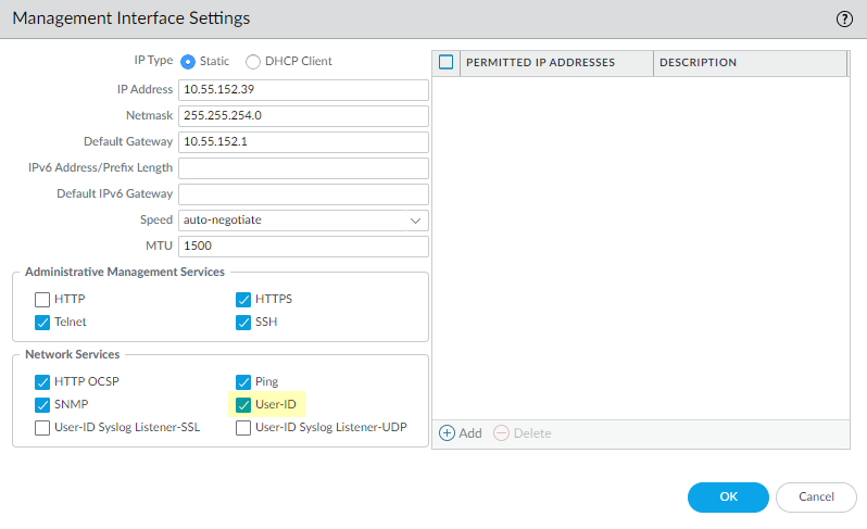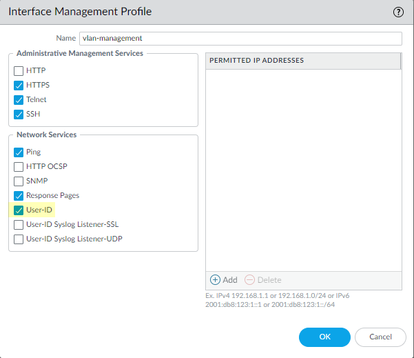• If the redistribution agent uses an interface on the dataplane (for example, an Ethernet or VLAN interface), select NetworkInterface Mgmt, select an existing management profile or Add a new one, and select User-ID.