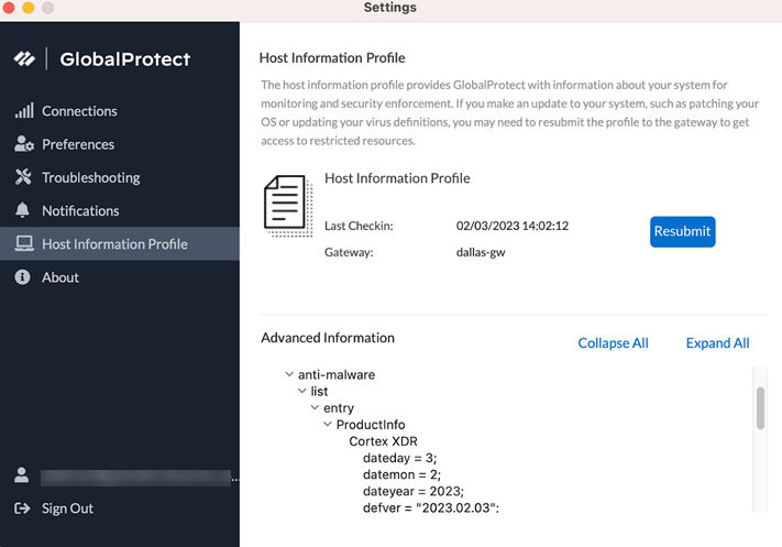 - From the GlobalProtect app, select SettingsHost Information Profile.Check the exact HIP category.