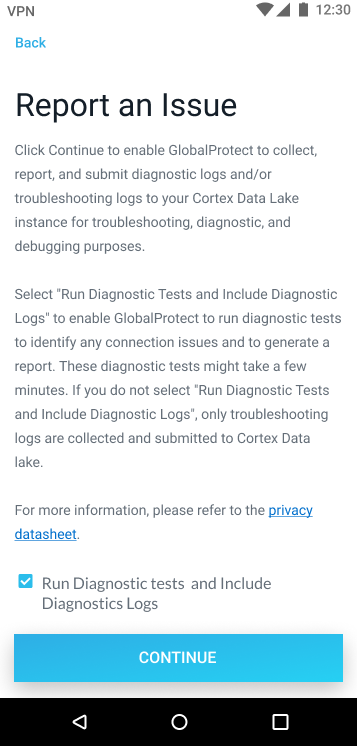 Enable the GlobalProtect app to run diagnostic tests and to include diagnostic logs. Both diagnostic and troubleshooting logs are collected and sent to Strata Logging Service as a compact troubleshooting report.After the diagnostic tests are successfully completed, the GlobalProtect debug log files are uploaded to Strata Logging Service from your endpoint.If you do not enable the app to run diagnostic tests and to include diagnostic logs, only troubleshooting logs are collected and sent to Strata Logging Service as a compact troubleshooting report. The GlobalProtect app checks for the report files (pan_gp.trb.log or pan_gp_trbl.log) that are automatically generated in .json format. A notification message appears if no issues were found in the troubleshooting logs. Click Retry to check if the pan_gp.trb*.log files exist.Select the Run Diagnostic Tests and Include Diagnostic Logs check box.Tap CONTINUE to allow the app to create a troubleshooting log and to send the report to your administrator’s Strata Logging Service instance.The results of the end-to-end diagnostic tests are stored in the pan_gp_diag.log file in .json format and sent to your administrator’s Strata Logging Service instance along with the pan_gp.trb*.log files.The results of the end-to-end diagnostic tests are stored in the pan_gp_diag.log file in .json format and sent to your administrator’s Strata Logging Service instance along with the pan_gp.trb*.log files. The GlobalProtect app can run diagnostic tests with a tunnel or without a tunnel. For example, you might want to enter your GlobalProtect login credentials prior to the app connecting and running diagnostic tests through the tunnel.