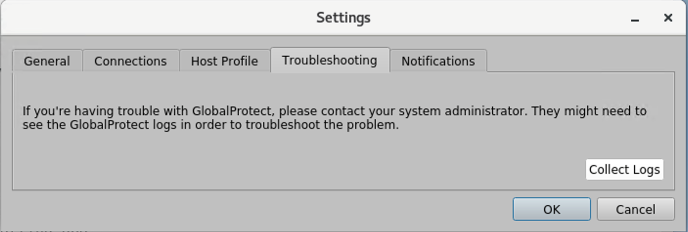 View any GlobalProtect notifications.Use the globalprotect show --notification command to view notifications.View the GlobalProtect system tray icon.Use the globalprotect launch-ui command to display the system tray icon on your desktop. You can launch the GlobalProtect app by clicking the system tray icon.View the Welcome page.Use the globalprotect show --welcome-page command. The GlobalProtect app displays the Welcome page in a browser if a Welcome page exists or displays a notification if the Welcome page does not exist.View errors.Use the globalprotect show --error command to view errors reported by the app.user@linuxhost:~$ globalprotect show --error Error: Cannot connect to GlobalProtect PortalCollect logs.The app stores the PanGPA and PanGPI log files in the /home/<user>/.Globalprotect directory. Use the globalprotect collect-logs command to enable the GlobalProtect app for Linux to package these logs and other useful information. You can then use the logs to troubleshoot issues or forward them to a Support engineer for expert analysis.user@linuxhost:~$ globalprotect collect-log Start collecting... collecting network info... collecting machine info... copying files... generating final result file... The support file is saved to /home/user/.GlobalProtect/Collect.tgzDisplay the version of the GlobalProtect app for Linux.user@linuxhost:~$ globalprotect show --version GlobalProtect: 6.0.0-23 Copyright(c) 2009-2021 Palo Alto Networks, Inc.