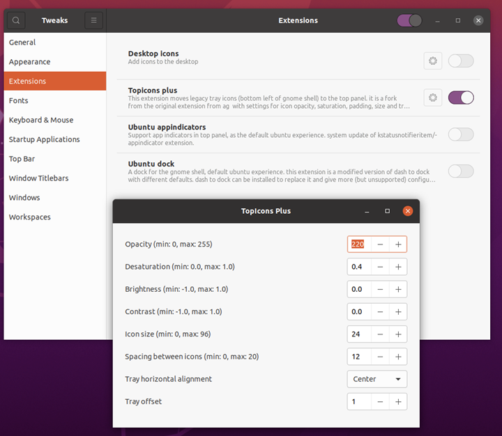 - Install the Topicons Gnome Tweak Tool Extension by running the following commands:sudo apt-get install gnome-shell-extension-top-icons-plussudo apt-get install gnome-tweak-toolReboot the system.From the Application menu, select TweaksExtensionsToggle the Topicons plus extension to enable the GlobalProtect icon to display in the system tray.If you don’t see the Topicons plus extension you may not have rebooted after installing the extension.You can also customize the icon setting such as icon size, alignment, and opacity.