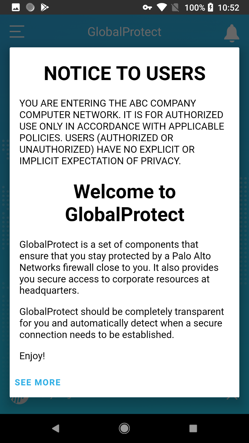 - (Optional) If your administrator configures the GlobalProtect app to display a welcome message, the welcome message appears upon successful connection. Tap outside of the welcome message to proceed to the home screen.