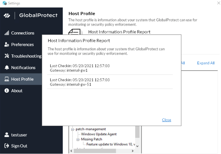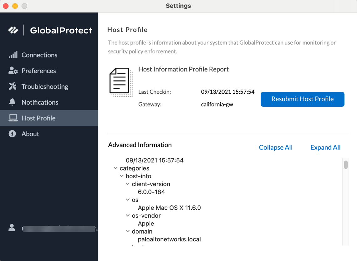 • Host Profile—The Host Profile tab displays the endpoint data that GlobalProtect uses to monitor and enforce security policies using the Host Information Profile. You can Resubmit Host Profile to manually resubmit HIP data to the gateway.
