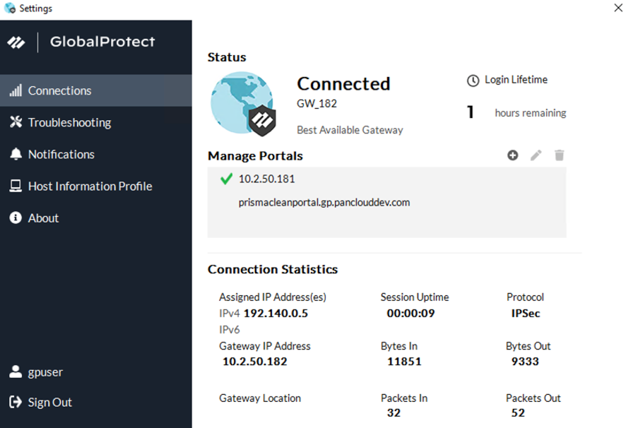 • Connections—The Connections tab displays the portal(s) associated with the GlobalProtect account. You can add, edit, or delete portals from this tab. This tab also displays the gateway to which you are connected. You can view connection statistics about the gateway (for example, gateway IP address, location, and VPN session uptime) when your administrator sets Enable Advanced View to Yes in the GlobalProtect portal agent configuration.