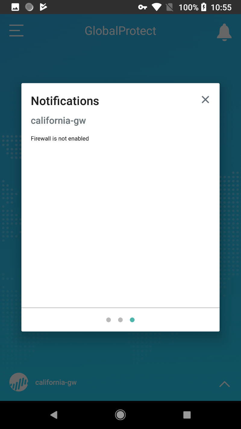 - (Optional) If your administrator configures the GlobalProtect app to display a welcome message, the welcome message appears upon successful connection. Tap outside of the welcome message to proceed to the home screen.