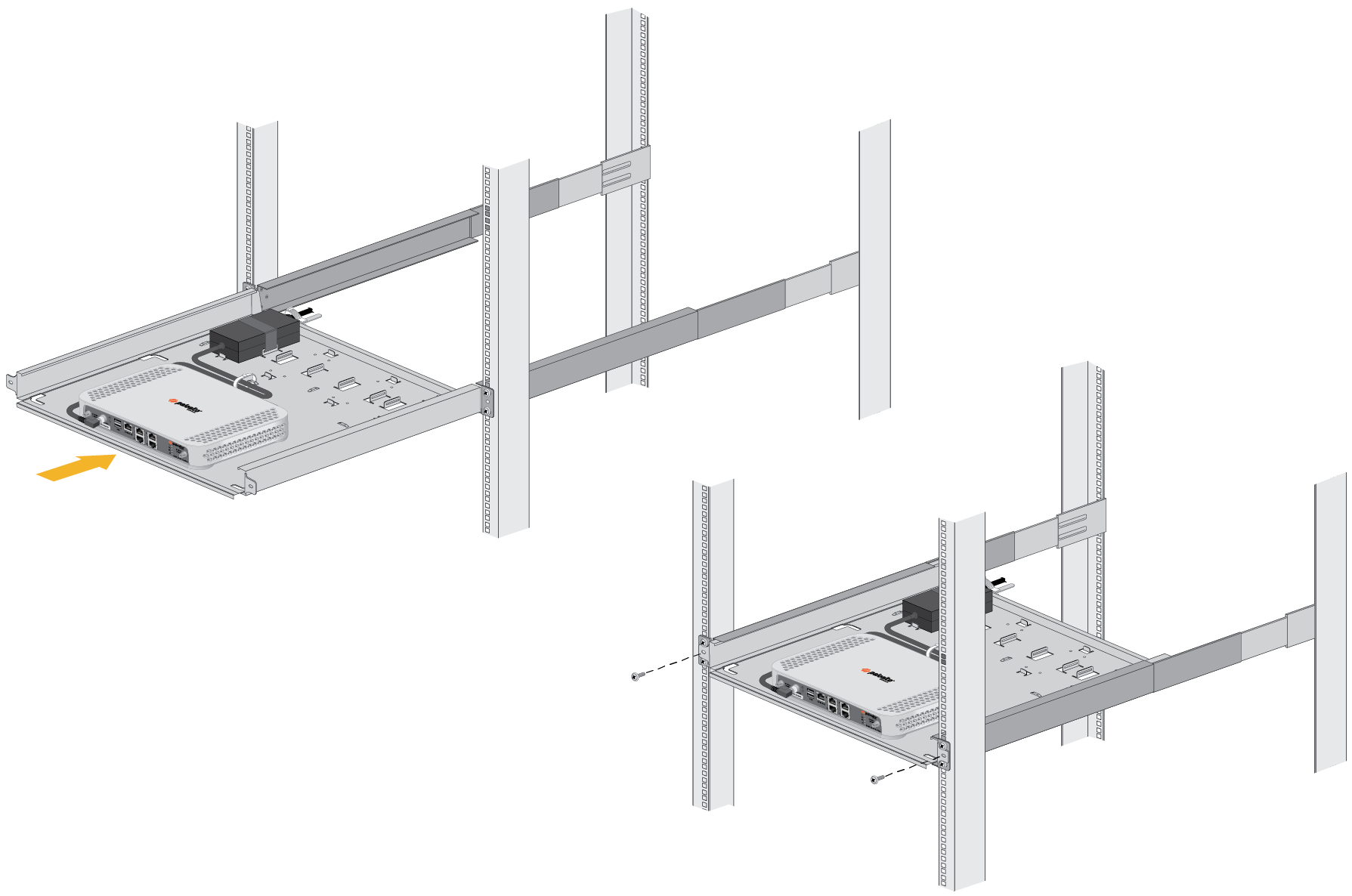 Slide the mounting tray into the rails previously fixed to the equipment rack. Stop when the front flange on the mounting tray is flush with the front of the rail.Align the slotted holes in the mounting tray to the holes in the equipment frame. Secure the mounting tray to the equipment frame on both sides using 3 screws each (not provided). The screws must be compatible with your equipment frame.