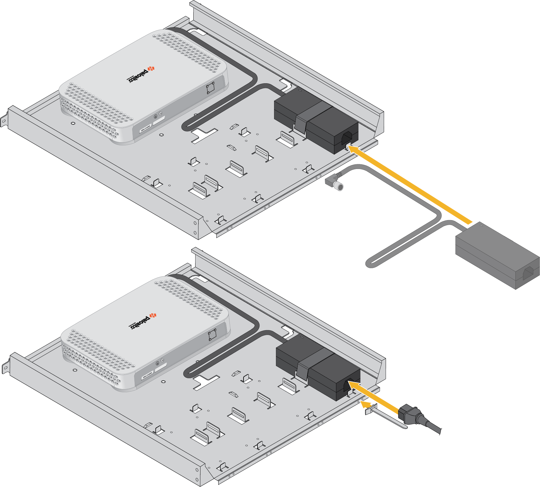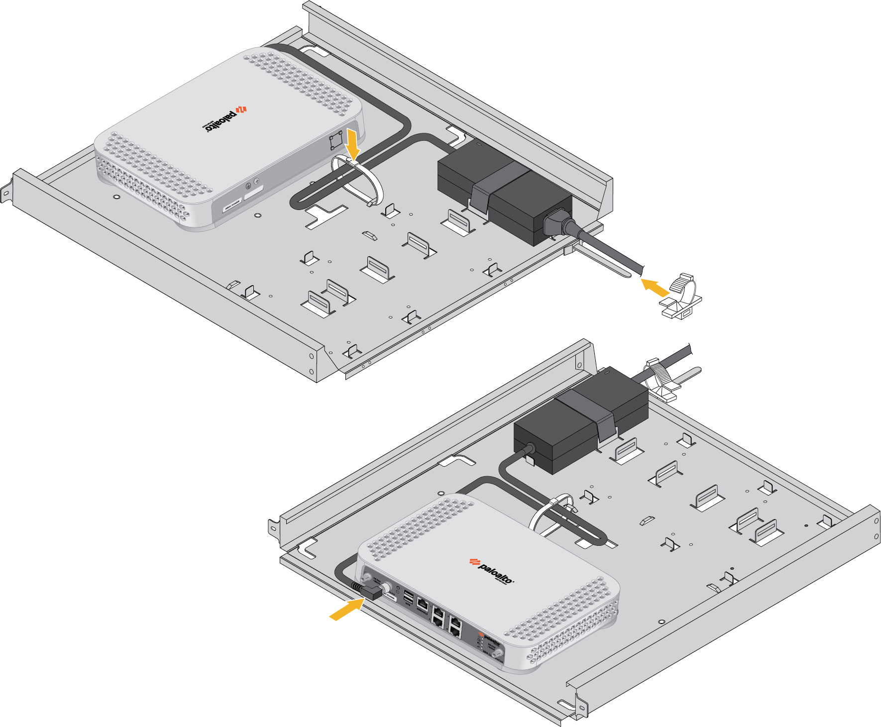 Plug the power supply connector into the back of the device. Using the provided tie-wraps, bind and secure the power supply cable to the metal hooks in the mounting tray.