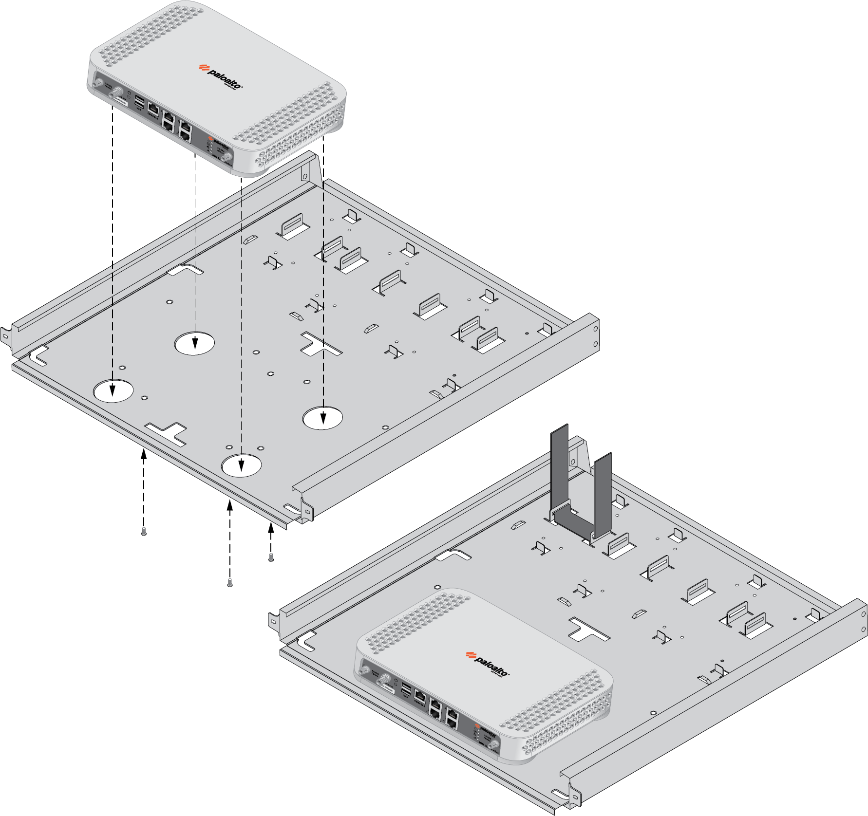 With the front of the device facing forward, align the four rubber feet on the bottom of the device to the slotted holes in the provided mounting tray.