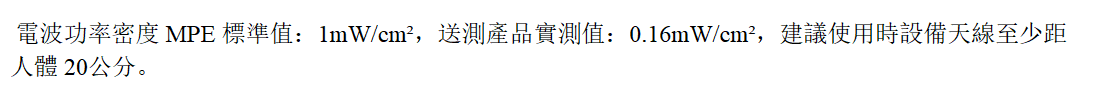 The standard value of radio wave power density MPE: 1mW/cm², the actual measured value of the product sent for testing: 0.16mW/cm², it is recommended that the device antenna be at least 20centimeters away from the human body when used.
