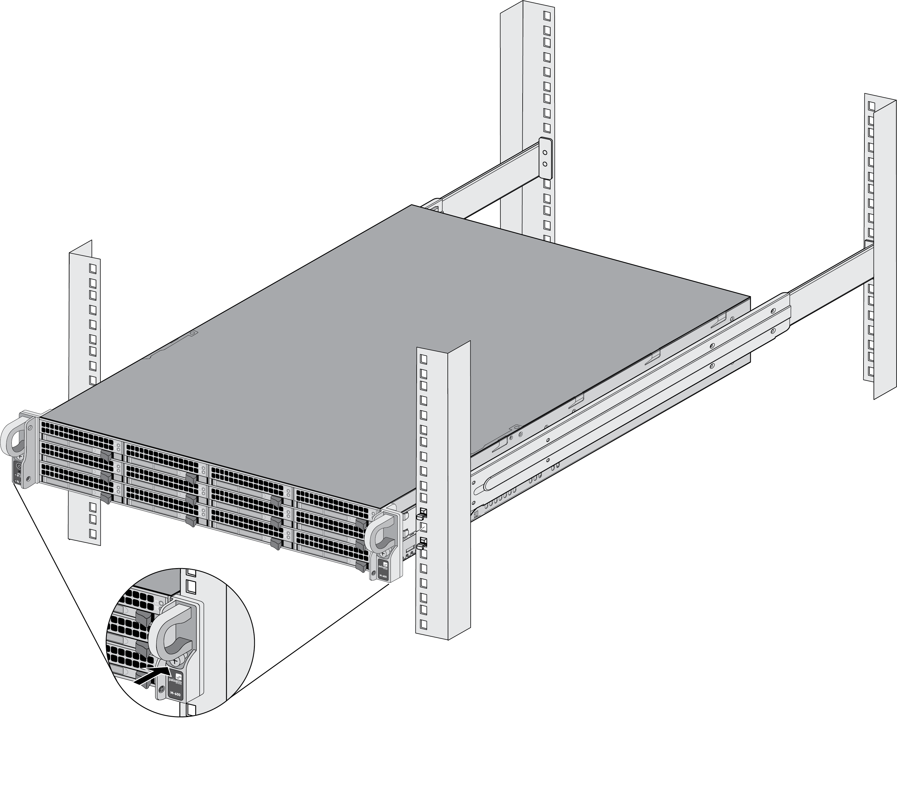 the M-600 appliance in a four-post equipment rack. The rack kit