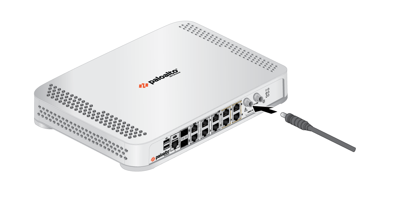 - Remove the screw and star washer from the ground point on the back of the firewall.Crimp a 14AWG ground cable to a ring lug (cable and lug not included), place the ring lug over the screw and star washer, then replace the screw to attach the cable to the firewall. Torque the screw to 25 in-lbs and then connect the other end of the cable to earth ground.Connect the connector from the power adapter into the PWR 1 port on the firewall and tighten the connector nut to secure the cable to the firewall.The power adapter inputs for the PA-440, PA-450, and PA-460 are on the back panel of the device. The power adapter inputs for the PA-415, PA-415-5G, PA-455, PA-455-5G, and PA-445 are on the front panel of the device.Ensure the power adapter itself is appropriately positioned (see Install the PA-400 Series Firewall).(PA-415, PA-415-5G, PA-455, PA-455-5G, and PA-445 (PA-415 pictured))![]() (PA-440, PA-450, and PA-460) (PA-440, PA-450, and PA-460)![]() Plug the connector from the power adapter into your power source. After power is connected, the firewall powers on as indicated by the green power LED next to the PWR 1 port. The front PWR LED shows green when a functioning power adapter is connected.(Optional for PA-415, PA-415-5G, PA-440, PA-445, PA-455-5G, PA-450, and PA-460) Plug the connector from a second power adapter (purchased separately) into the PWR 2 port and plug the connector into a power source.For the PA-415, PA-415-5G, PA-440, PA-445, PA-450, PA-455, PA-455-5G, and PA-460, connect the second power adapter through a different circuit breaker to provide power redundancy and to allow for electrical circuit maintenance.On the PA-440, PA-450, and PA-460, the control check on the power supply can detect if a connection is present but does not check for voltage. As a result, if the power cable is connected to the firewall but disconnected from a power source, the system still reads the power connection as inserted.On some PA-440, PA-450, and PA-460 models, the show system environmentals command in the CLI displays the status of a second power supply when a second power supply is not connected.Before powering on the firewall, ensure that you have connected your Ethernet cables in accordance to the mode you wish to boot the firewall in (standard mode or Zero Touch Provisioning mode) as specified in Set Up a Connection to the Firewall. Plug the connector from the power adapter into your power source. After power is connected, the firewall powers on as indicated by the green power LED next to the PWR 1 port. The front PWR LED shows green when a functioning power adapter is connected.(Optional for PA-415, PA-415-5G, PA-440, PA-445, PA-455-5G, PA-450, and PA-460) Plug the connector from a second power adapter (purchased separately) into the PWR 2 port and plug the connector into a power source.For the PA-415, PA-415-5G, PA-440, PA-445, PA-450, PA-455, PA-455-5G, and PA-460, connect the second power adapter through a different circuit breaker to provide power redundancy and to allow for electrical circuit maintenance.On the PA-440, PA-450, and PA-460, the control check on the power supply can detect if a connection is present but does not check for voltage. As a result, if the power cable is connected to the firewall but disconnected from a power source, the system still reads the power connection as inserted.On some PA-440, PA-450, and PA-460 models, the show system environmentals command in the CLI displays the status of a second power supply when a second power supply is not connected.Before powering on the firewall, ensure that you have connected your Ethernet cables in accordance to the mode you wish to boot the firewall in (standard mode or Zero Touch Provisioning mode) as specified in Set Up a Connection to the Firewall.