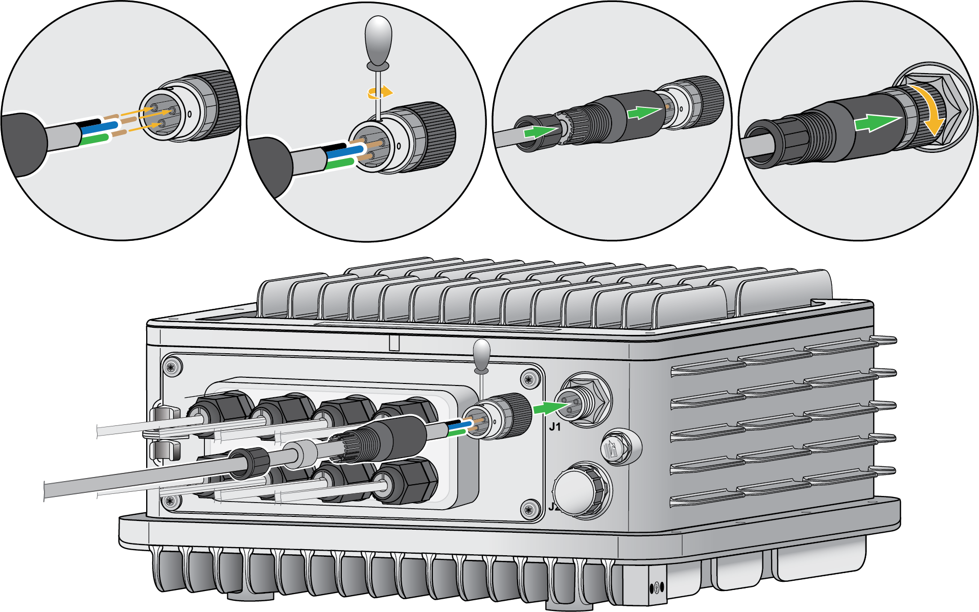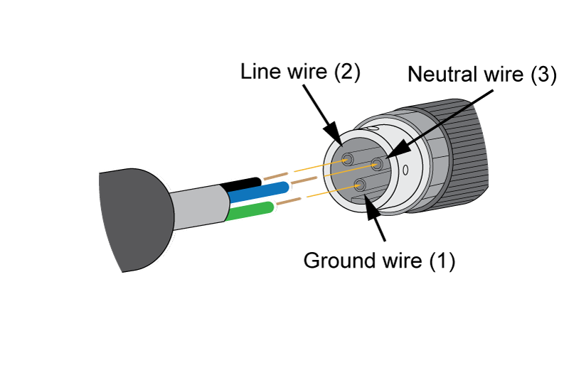 - Remove the power cable jacket and strip the three wires (two conductors and one ground cable).Assemble the connector using the provided instructions.