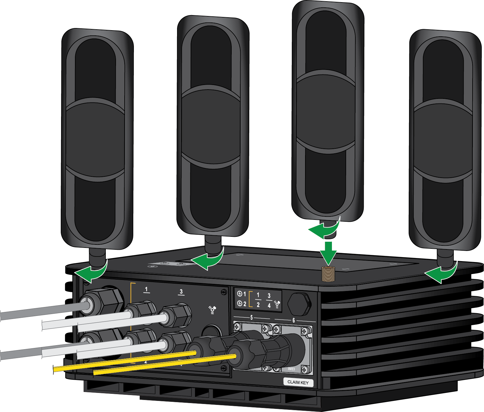 - Secure the antennas to the SMA connectors located at the corners of the device. Make sure to tighten each antenna by hand. The antennas are fixed at a 90 degree orientation but can be repositioned after installation.(PA-410R-5G)![]() (PA-450R-5G) (PA-450R-5G)![]() (PA-410R-5G only) Fold the antennas at a 90 degree angle so that the device can be appropriately installed on a wall or DIN rail. While viewing the back panel of the device, ensure that the top two antennas point straight up and that the bottom two antennas point straight down. (PA-410R-5G only) Fold the antennas at a 90 degree angle so that the device can be appropriately installed on a wall or DIN rail. While viewing the back panel of the device, ensure that the top two antennas point straight up and that the bottom two antennas point straight down.![]() Adjust the antenna orientation to receive the optimal signal strength in your environment.Check the signal strength of the firewall by viewing the Cellular LED (see Interpret the LEDs on a PA-400R Series Firewall) or by checking the Firewall Web Interface.Do not point the antennas towards one another or place them close to one another.Ensure that power cables do not cross over the antennas as this can cause signal quality distortion and antenna performance degradation. Adjust the antenna orientation to receive the optimal signal strength in your environment.Check the signal strength of the firewall by viewing the Cellular LED (see Interpret the LEDs on a PA-400R Series Firewall) or by checking the Firewall Web Interface.Do not point the antennas towards one another or place them close to one another.Ensure that power cables do not cross over the antennas as this can cause signal quality distortion and antenna performance degradation.