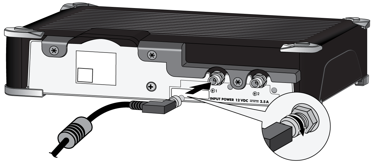 PA-520 and PA-540Plug the DC connector from the power adapter into the port on the firewall and tighten the connector nut to secure the cable to the firewall.