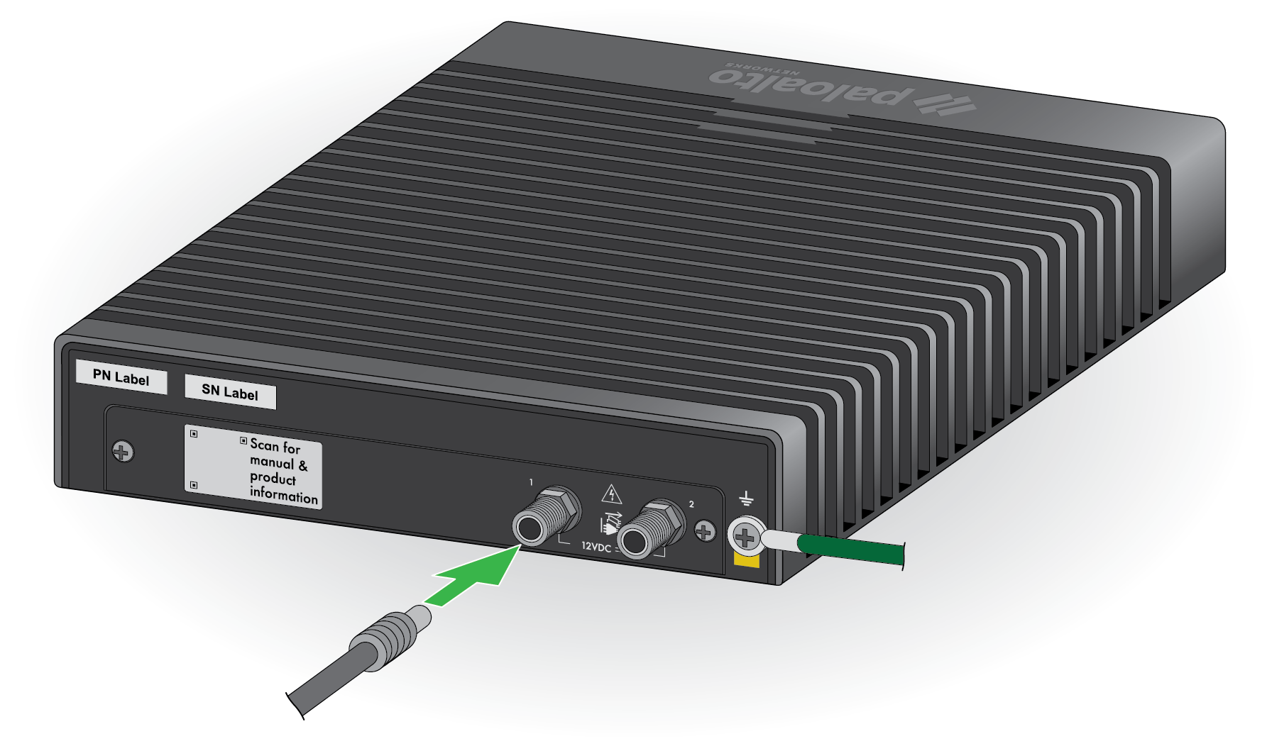 PA-510Connect the power adapter connector into the left port on the back of the firewall. Tighten the connector nut to secure the cable to the firewall.