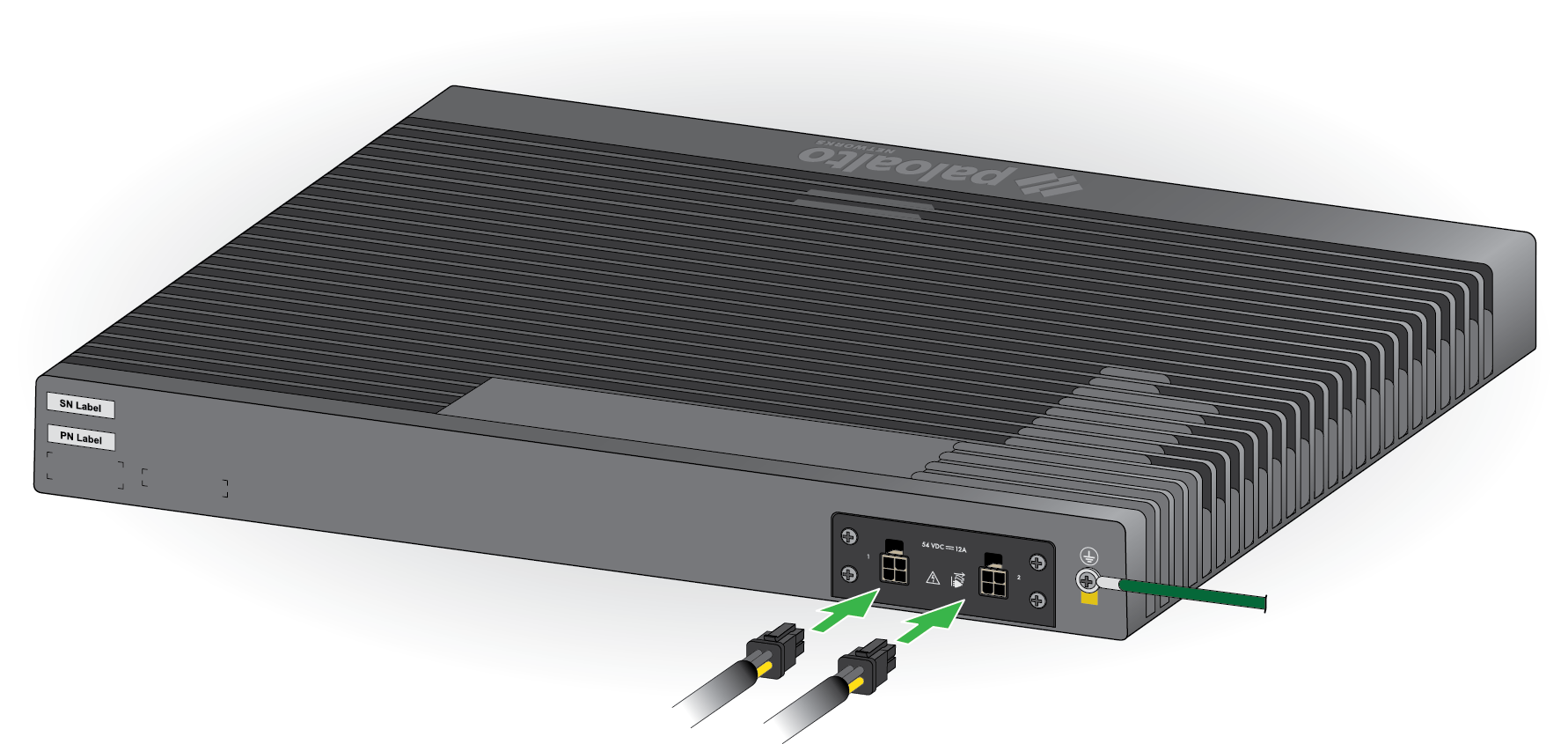 - Make sure that your AC power source is powered off.Remove the screw from the ground point on the back of the firewall.Crimp a 14AWG ground cable to a ring lug (ground cable not included), place the ring lug over the screw, then replace the screw to attach the cable to the firewall. Torque the screw to 25 in-lbs and then connect the other end of the cable to earth ground.Connect the power adapter to the first power input on the back of the firewall.PA-505Insert the DC connector from the power adapter into the port on the back of the firewall. Snap the DC connector cable to the cord retainer.