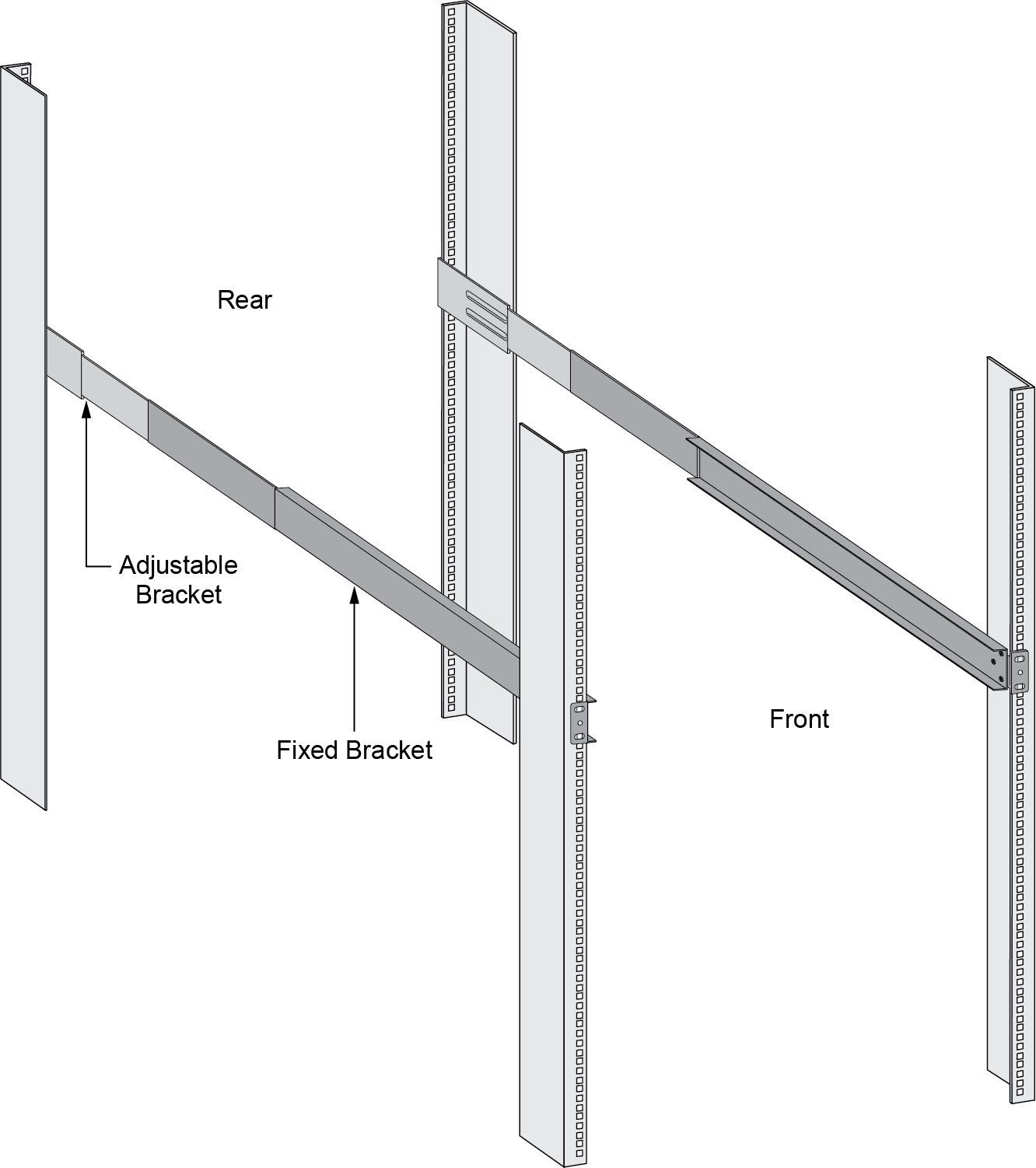 Slide one of the adjustable mounting brackets into one of the fixed mounting brackets to create a mounting rail. Repeat for the second mounting rail. The adjustable and fixed brackets are the same for the left and right side.