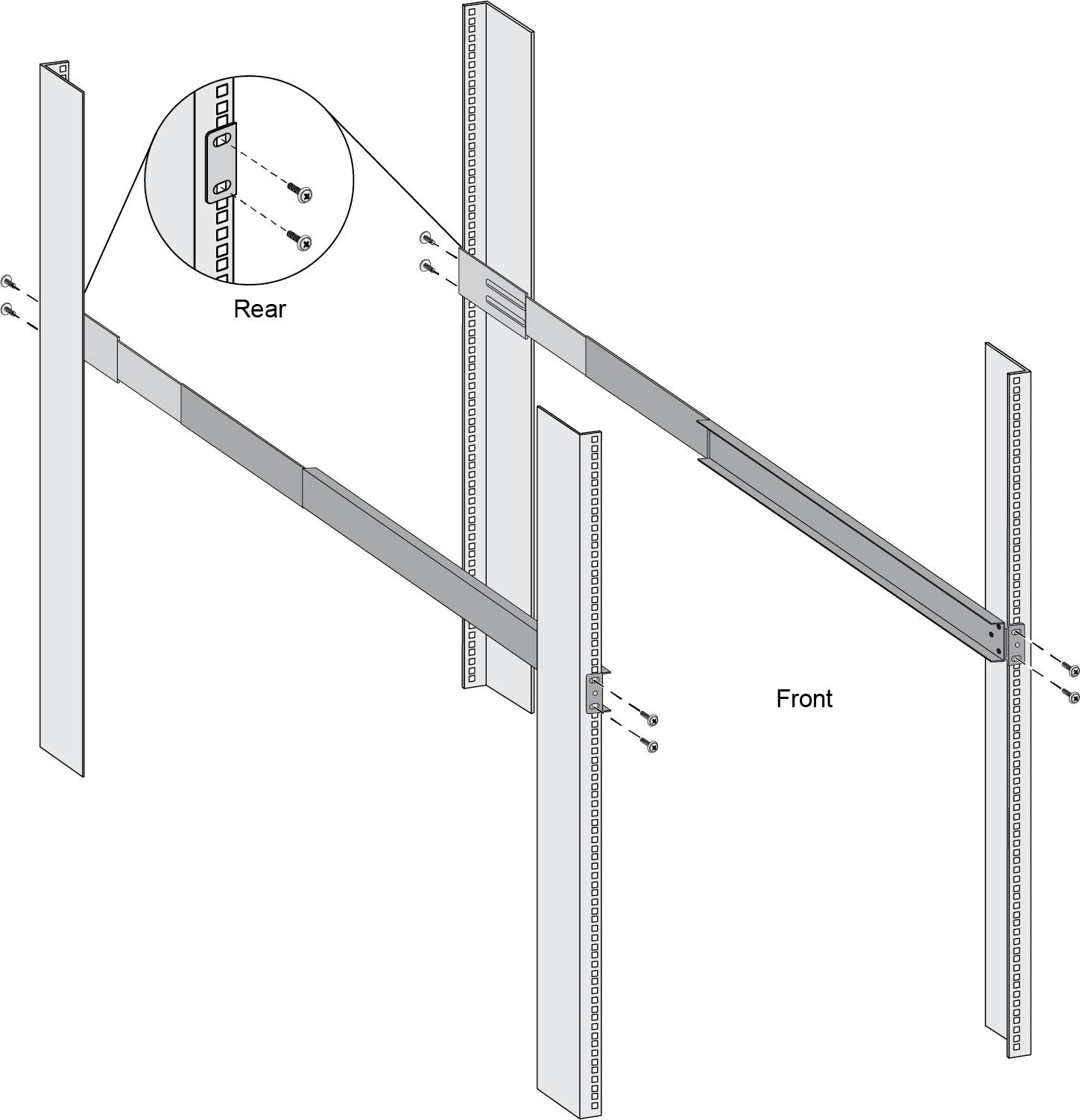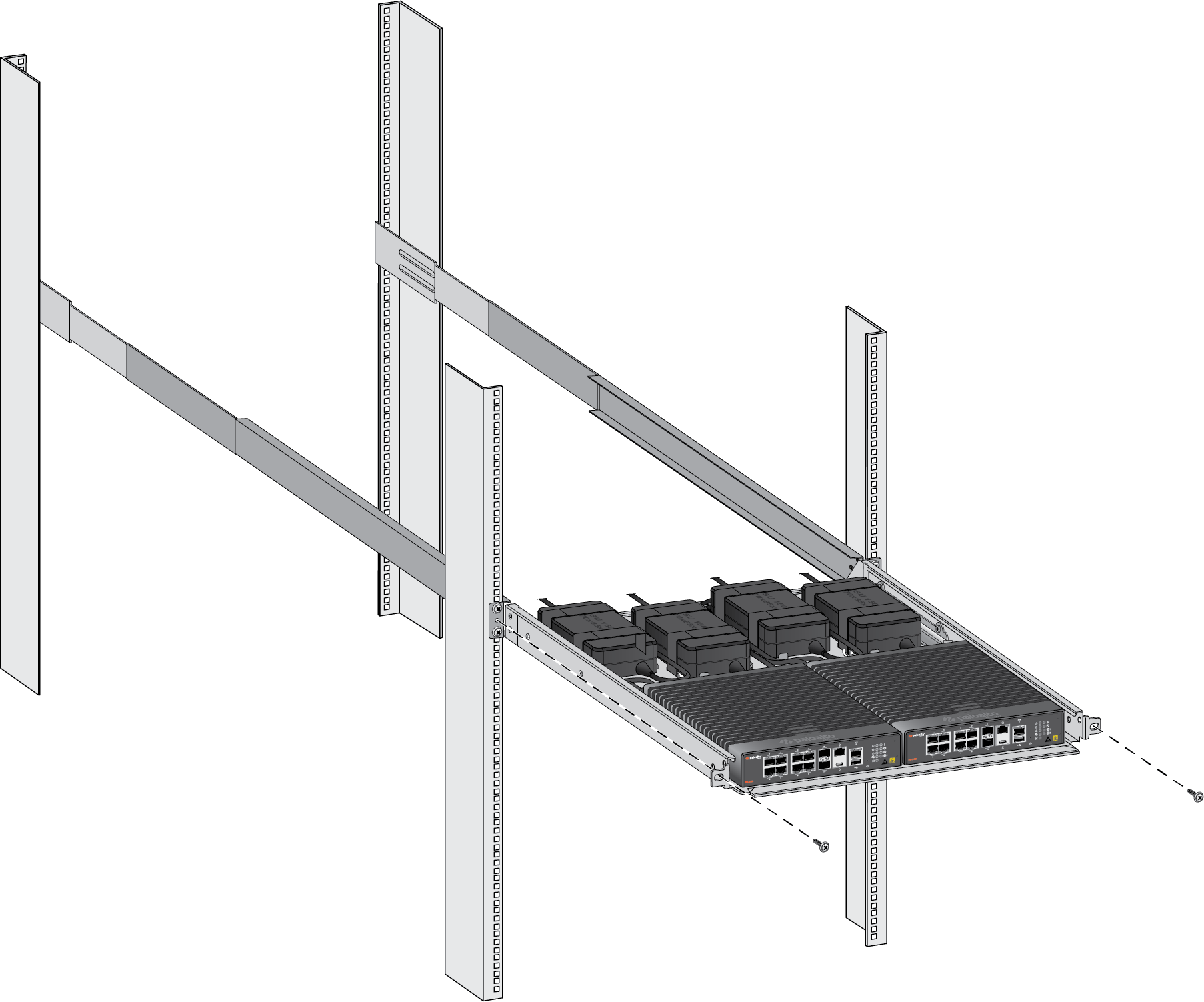 Align the bottom edge of the mounting rails to the bottom of the space reserved for your firewall. Align the slotted holes in the adjustable mounting bracket to the holes on the rear of the equipment frame.Secure the rails to the equipment frame with mounting screws (not provided) compatible with your equipment frame. Tighten the screws to their recommended torque value.