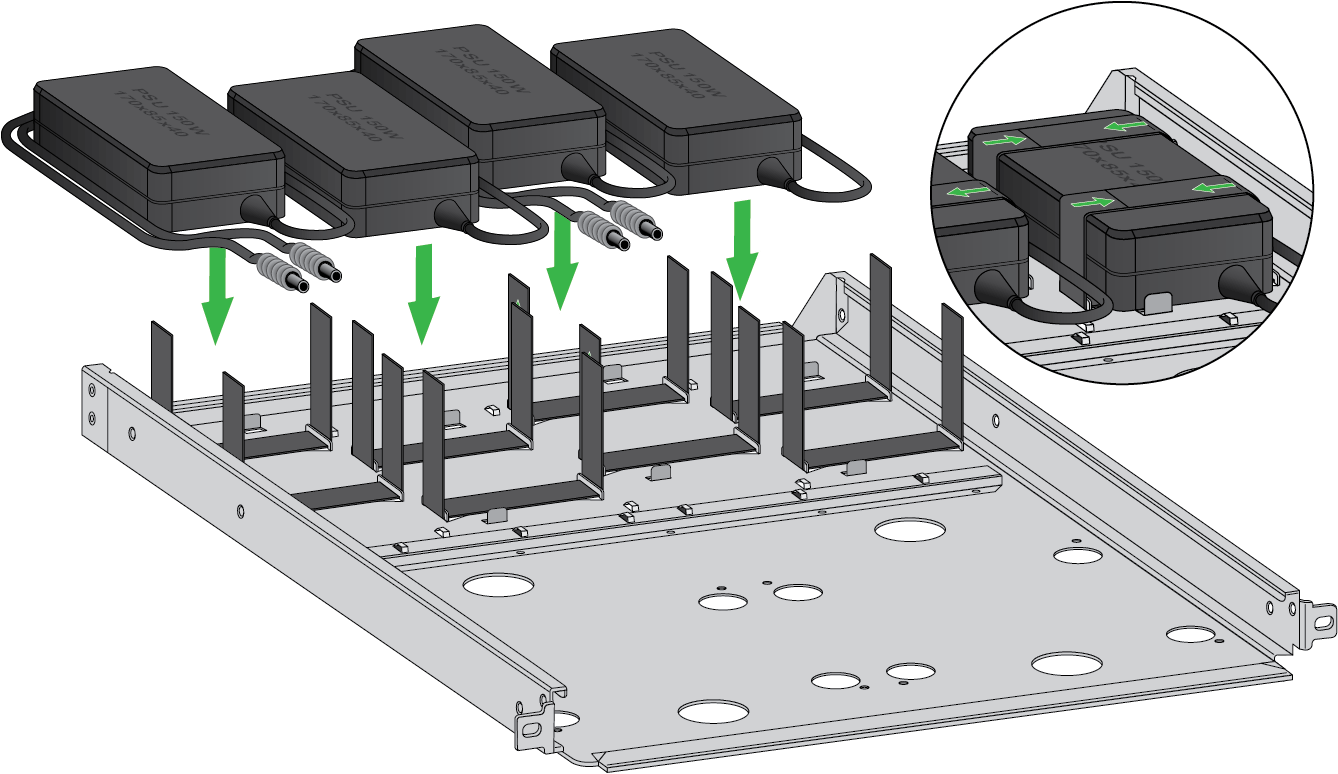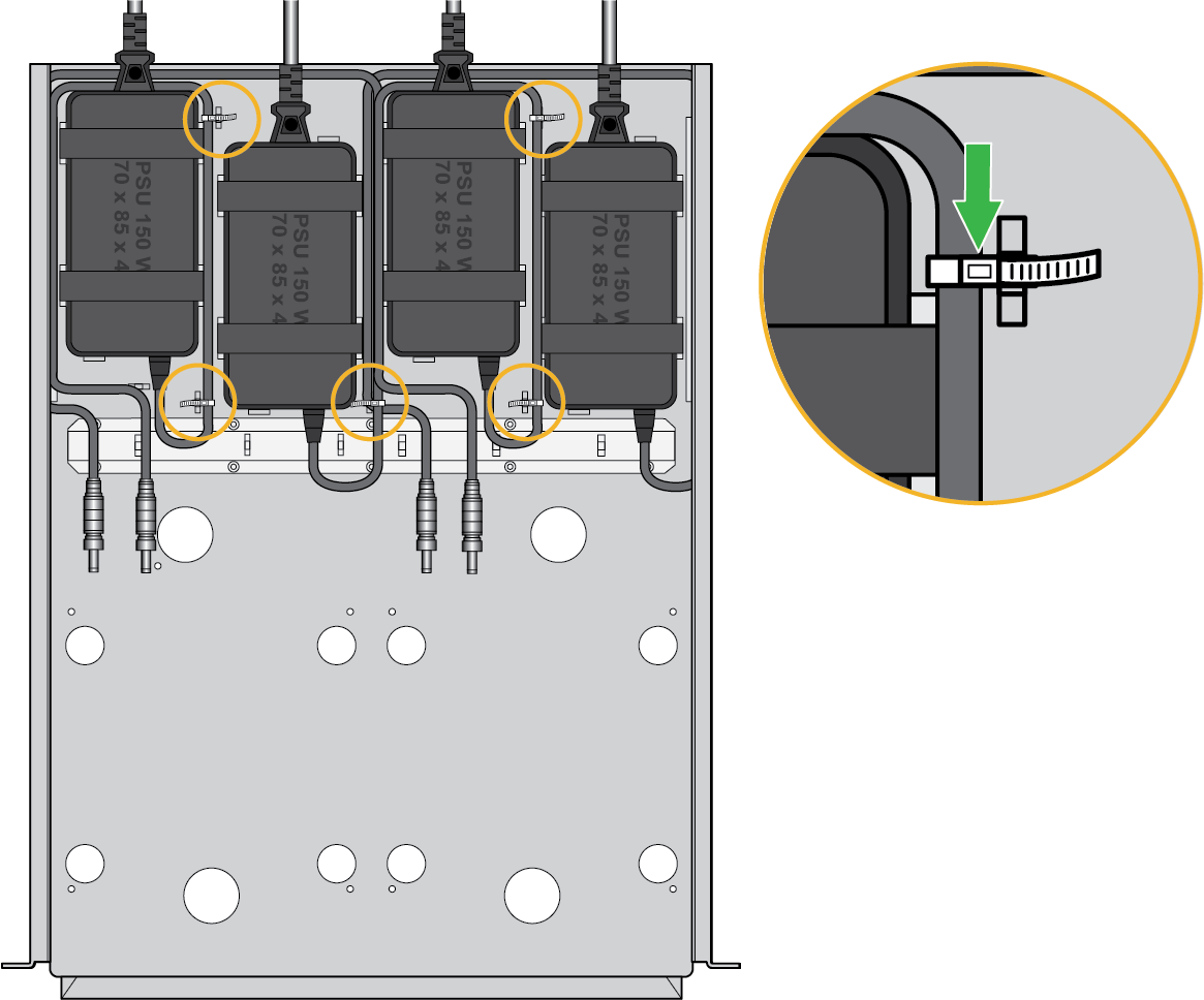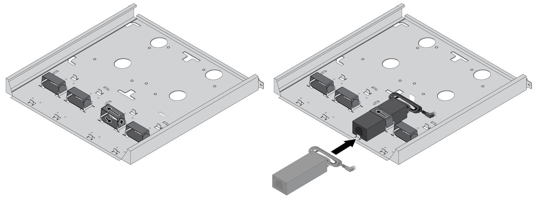 - Place each power adapter into its designated location, then wrap each Velcro strap over the top of the adapter so that the adapter is fixed in place.