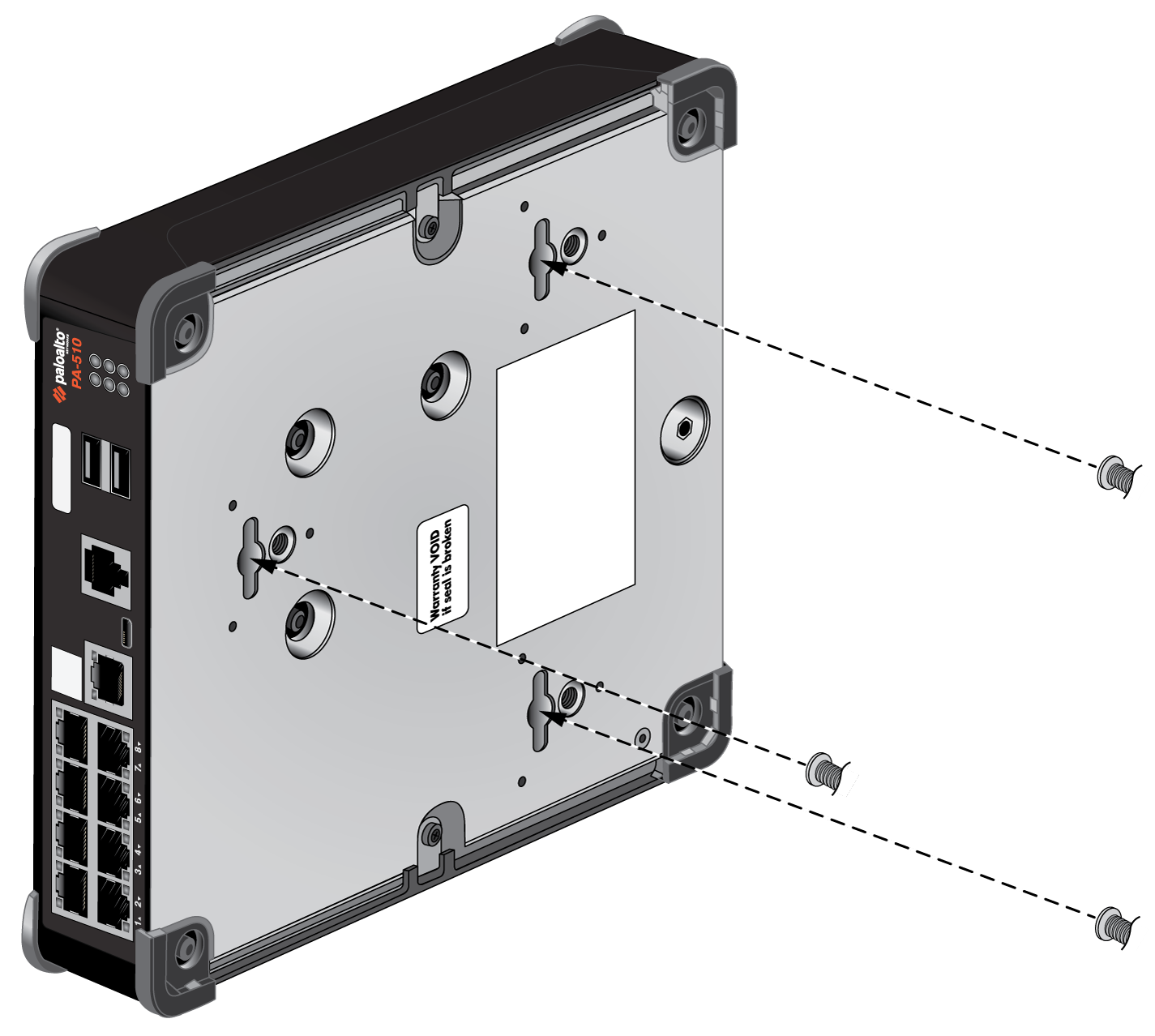 - Mark the locations on the wall that line up with the wall mount holes on the bottom of the firewall.For the PA-505, mark four wall mount hole locations.For the PA-510, mark three wall mount hole locations.Ensure there are no building services (water, gas, or wiring) behind the wall where you intend to install the firewall.Use a #1 Phillips-head screwdriver to install the appropriate screws into each of the three or four marked locations: