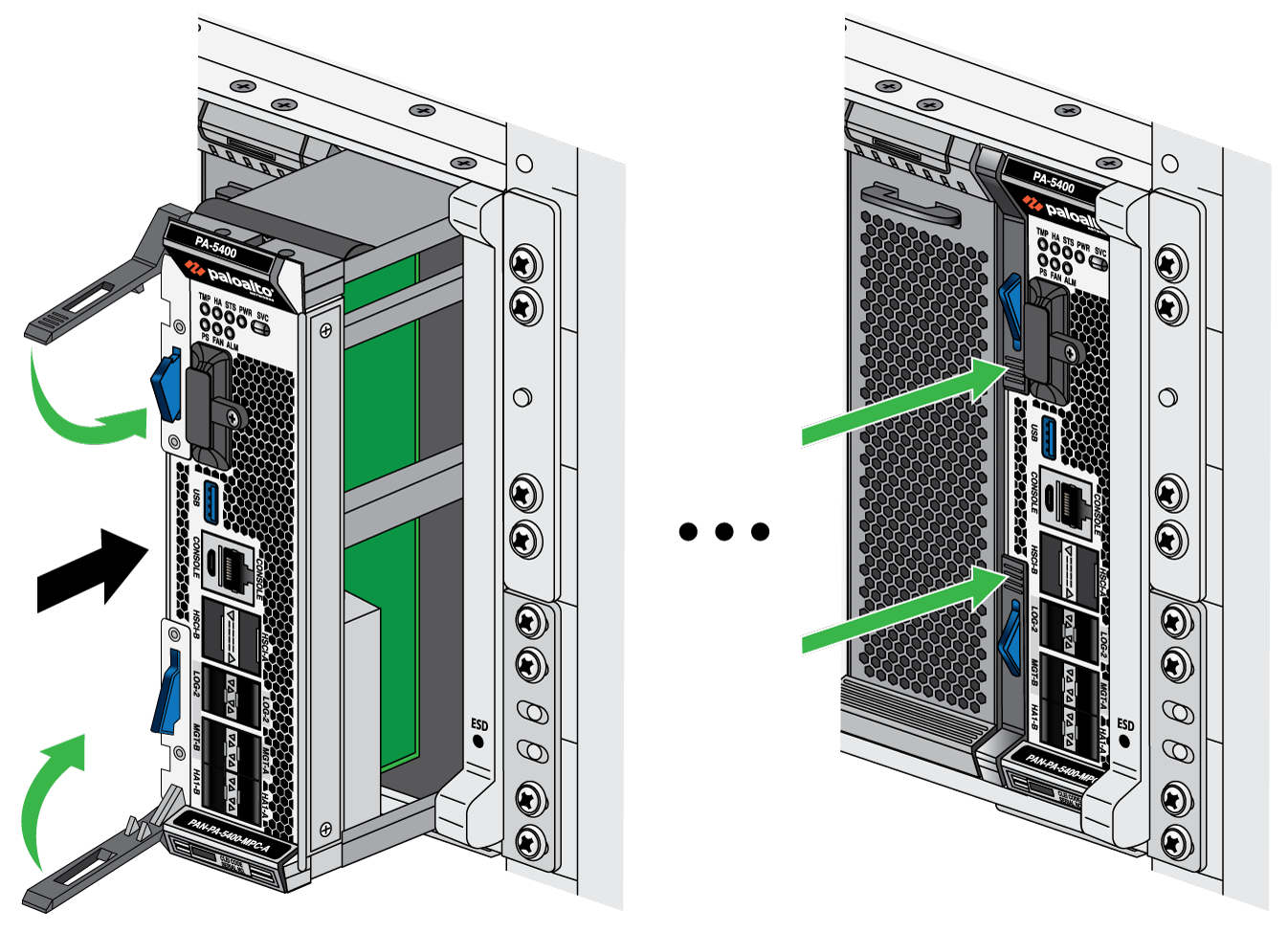 - Attach the provided ESD strap to your wrist and plug the other end in to the ESD port location on the front of the appliance. See PA-5450 Front Panel for the location of the ESD port.Remove the NC from the antistatic bag. Push the top and bottom ejector tabs towards each other to allow the ejector levers to rotate into an open position.The image below shows a Management Processor Card (MPC); however, the procedure to install the NC is the same.![]() Rotate the card and align it with the front of the appliance so that the Palo Alto Networks logo is readable at the top of the card. Gently push the NC into slot 1 until the card reaches the end of the slot.The PA-5450 firewall makes use of paired Logical Card Slots in order to direct processing power from a Data Processing Card (DPC) to a corresponding NC. When installing a DPC, you must install it in the correct slot to pair with the NC.Push on both ejector handles until they lock the card into place.(Optional) Repeat Steps 3 through 5 in slot 2 if you wish to install a second NC.(If you have unused front slots) Install a blank panel into each unused card slot to help the appliance maintain system air flow. Ensure that the bottom “teeth” of the blank panel fit into the notches on the bottom of the slot. Rotate the blank panel upwards until it snaps at the top of the slot. Rotate the card and align it with the front of the appliance so that the Palo Alto Networks logo is readable at the top of the card. Gently push the NC into slot 1 until the card reaches the end of the slot.The PA-5450 firewall makes use of paired Logical Card Slots in order to direct processing power from a Data Processing Card (DPC) to a corresponding NC. When installing a DPC, you must install it in the correct slot to pair with the NC.Push on both ejector handles until they lock the card into place.(Optional) Repeat Steps 3 through 5 in slot 2 if you wish to install a second NC.(If you have unused front slots) Install a blank panel into each unused card slot to help the appliance maintain system air flow. Ensure that the bottom “teeth” of the blank panel fit into the notches on the bottom of the slot. Rotate the blank panel upwards until it snaps at the top of the slot.